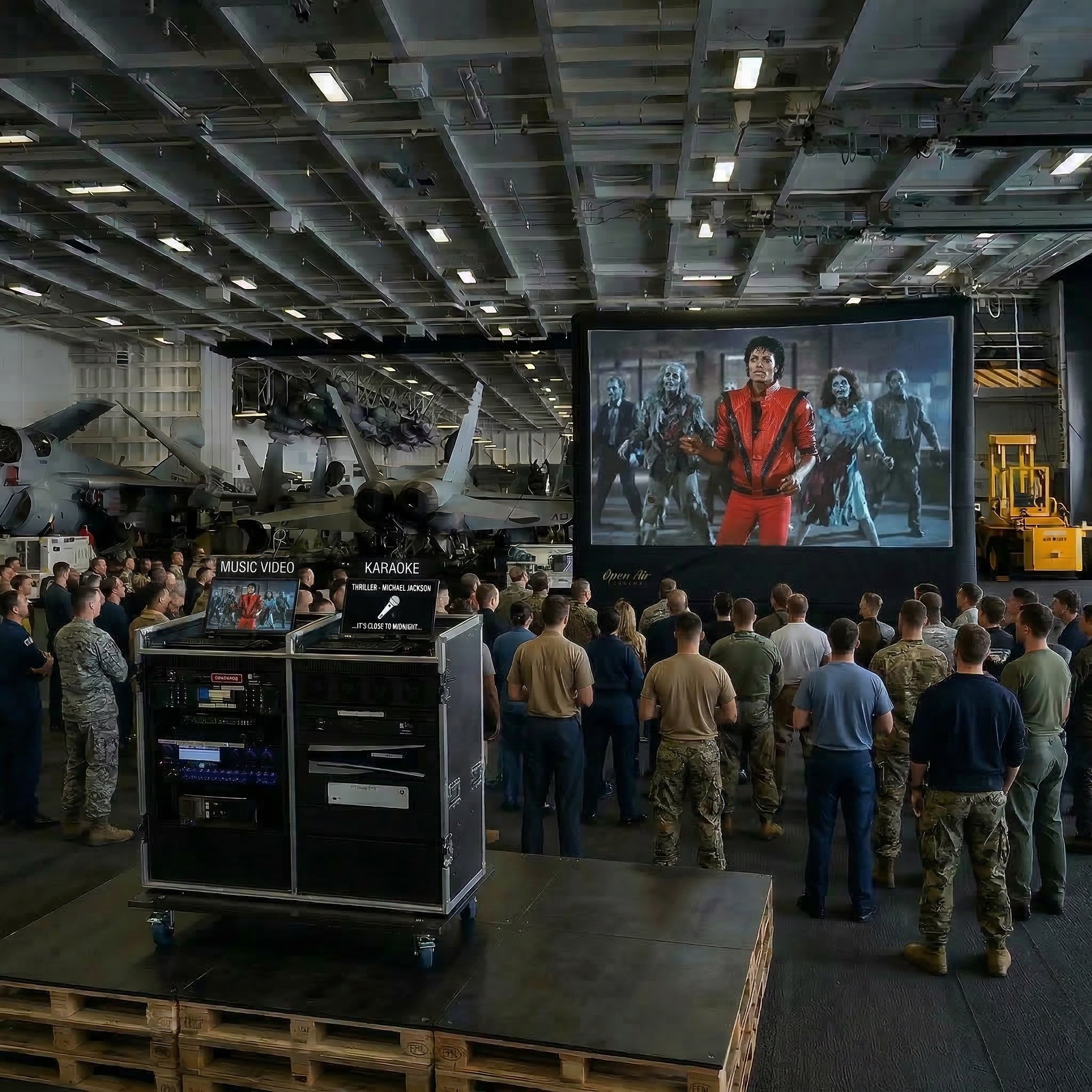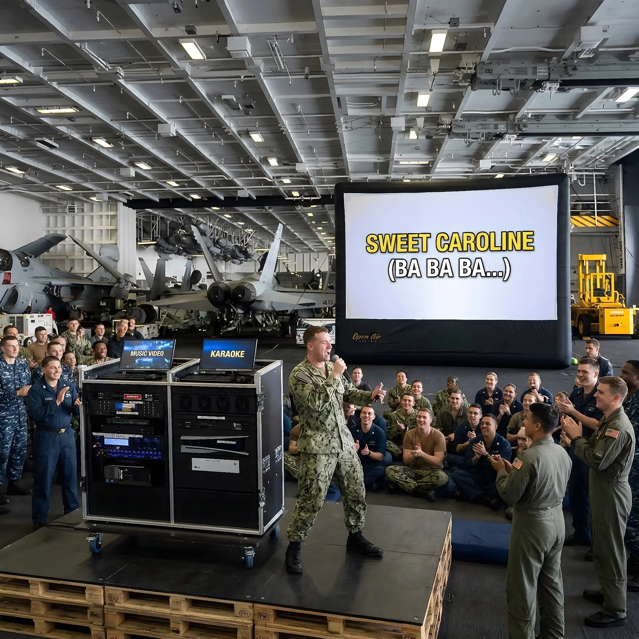 The Big Time Deployment Entertainment System combines all of Celebrity’s top selling MWR products into one mega solution. You want to host an outdoor movie night? It can do that. Schedule a small concert or open mic? It’s got that covered too. Your customers want to be the star of the show? Let them pick between Karaoke and Gameshow trivia. Oh, and did we mention that they can play their favorite video games on a massive inflatable screen?
